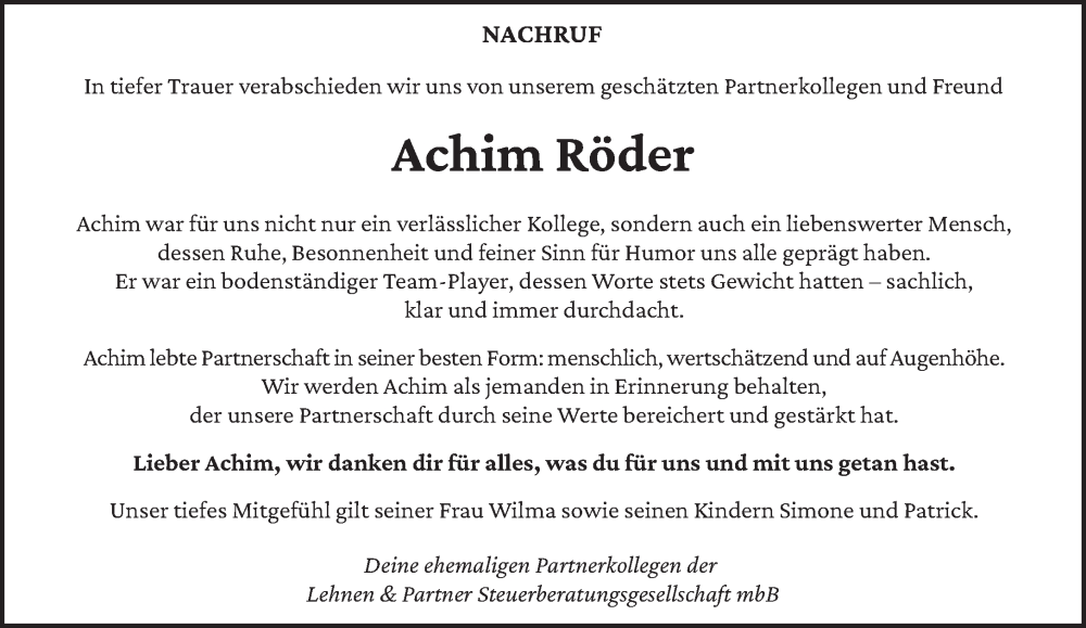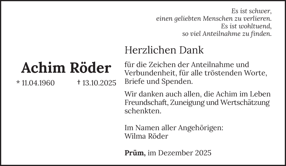 Hier finden Sie alle Traueranzeigen aus der Zeitung, die bisher für Achim Röder erschienen sind. Weitere Traueranzeigen, die in der Zeitung erscheinen, werden hier ebenfalls aufgelistet