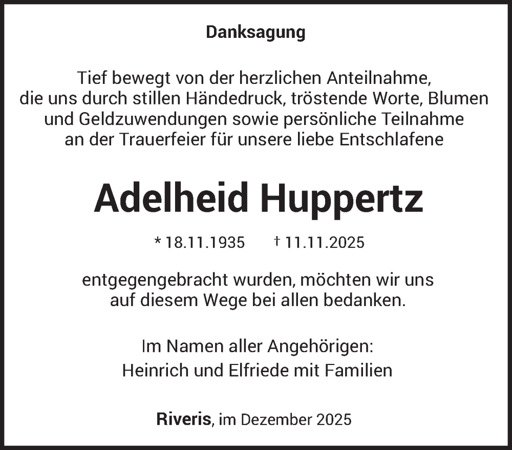 Hier finden Sie alle Traueranzeigen aus der Zeitung, die bisher für Adelheid Huppertz erschienen sind. Weitere Traueranzeigen, die in der Zeitung erscheinen, werden hier ebenfalls aufgelistet