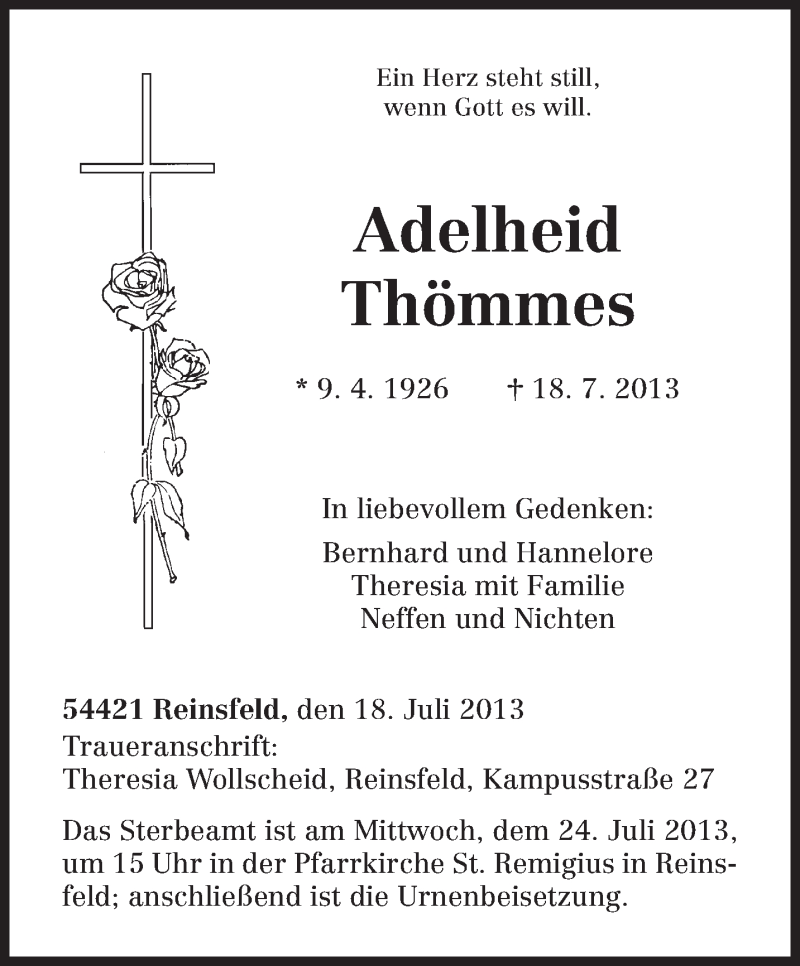 Hier finden Sie alle Traueranzeigen aus der Zeitung, die bisher für Adelheid Thömmes erschienen sind. Weitere Traueranzeigen, die in der Zeitung erscheinen, werden hier ebenfalls aufgelistet