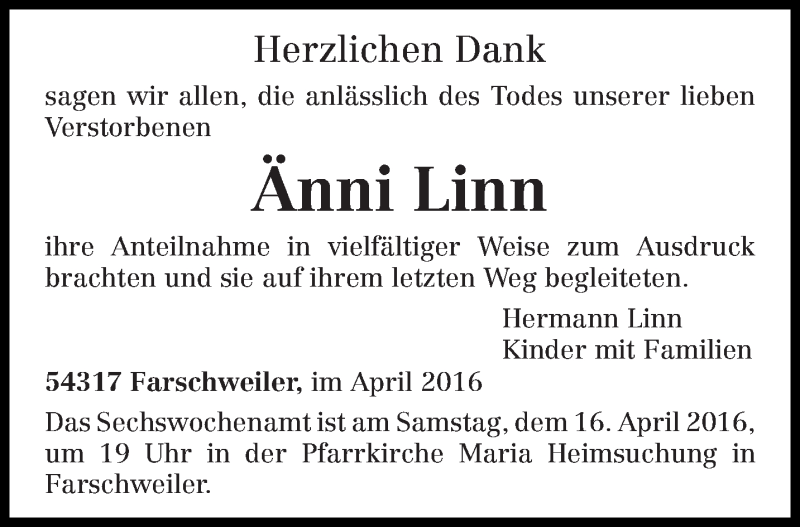 Hier finden Sie alle Traueranzeigen aus der Zeitung, die bisher für Änni Linn erschienen sind. Weitere Traueranzeigen, die in der Zeitung erscheinen, werden hier ebenfalls aufgelistet
