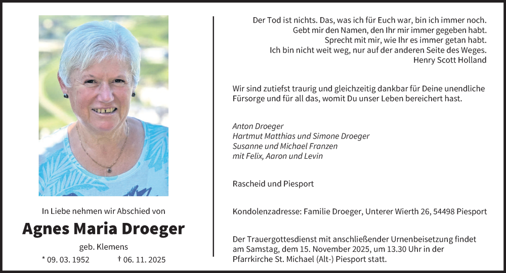 Hier finden Sie alle Traueranzeigen aus der Zeitung, die bisher für Agnes Maria Droeger erschienen sind. Weitere Traueranzeigen, die in der Zeitung erscheinen, werden hier ebenfalls aufgelistet