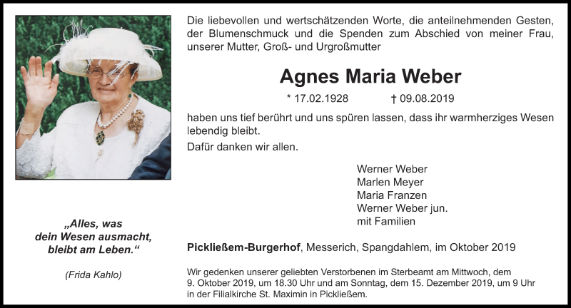 Hier finden Sie alle Traueranzeigen aus der Zeitung, die bisher für Agnes Maria Weber erschienen sind. Weitere Traueranzeigen, die in der Zeitung erscheinen, werden hier ebenfalls aufgelistet