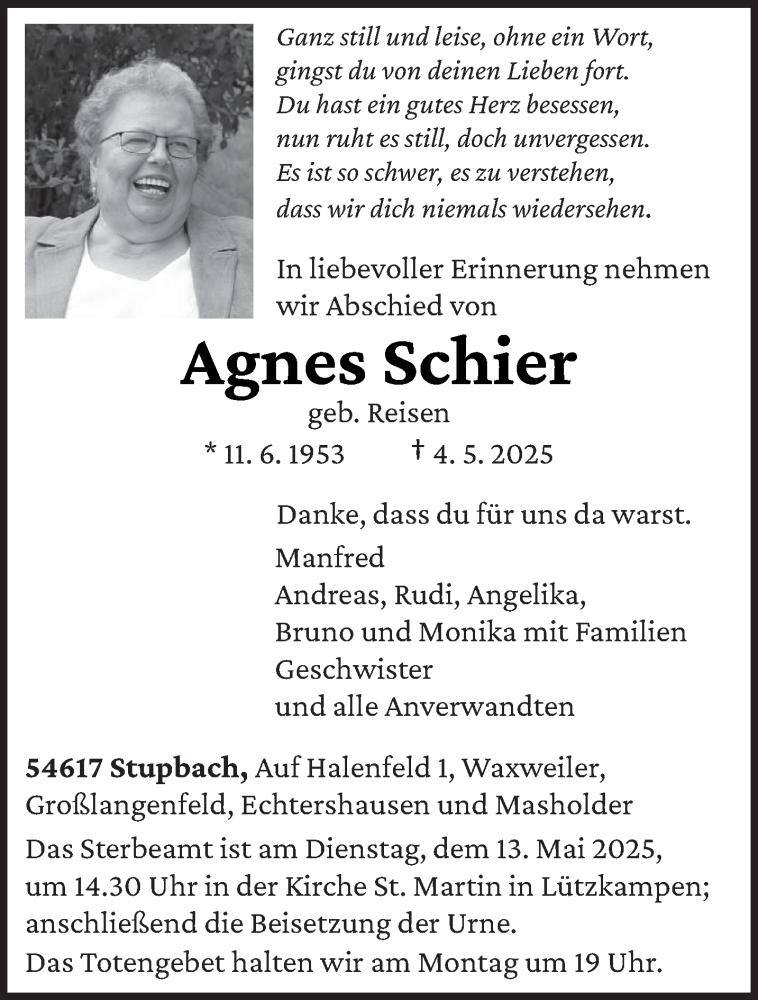 Hier finden Sie alle Traueranzeigen aus der Zeitung, die bisher für Agnes Schier erschienen sind. Weitere Traueranzeigen, die in der Zeitung erscheinen, werden hier ebenfalls aufgelistet