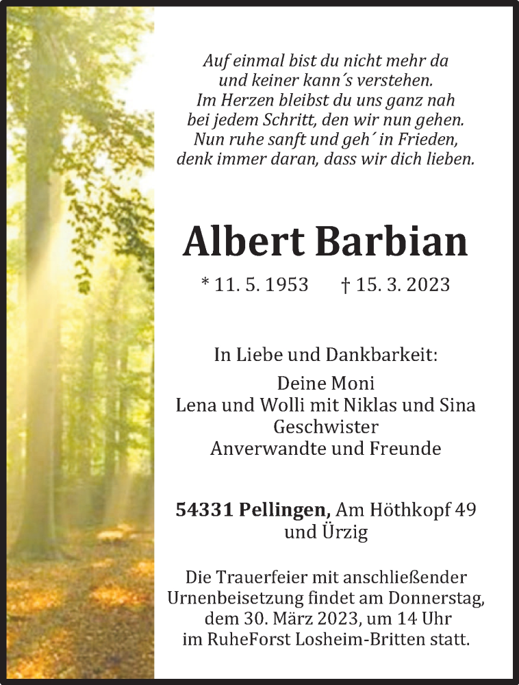 Hier finden Sie alle Traueranzeigen aus der Zeitung, die bisher für Albert Barbian erschienen sind. Weitere Traueranzeigen, die in der Zeitung erscheinen, werden hier ebenfalls aufgelistet