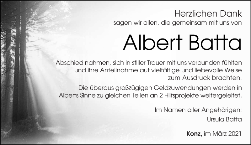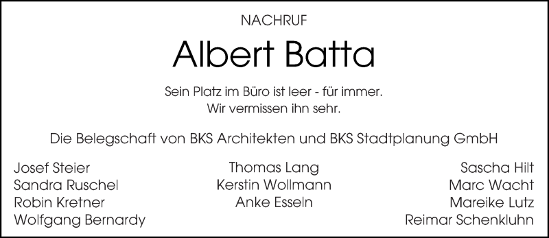 Hier finden Sie alle Traueranzeigen aus der Zeitung, die bisher für Albert Batta erschienen sind. Weitere Traueranzeigen, die in der Zeitung erscheinen, werden hier ebenfalls aufgelistet