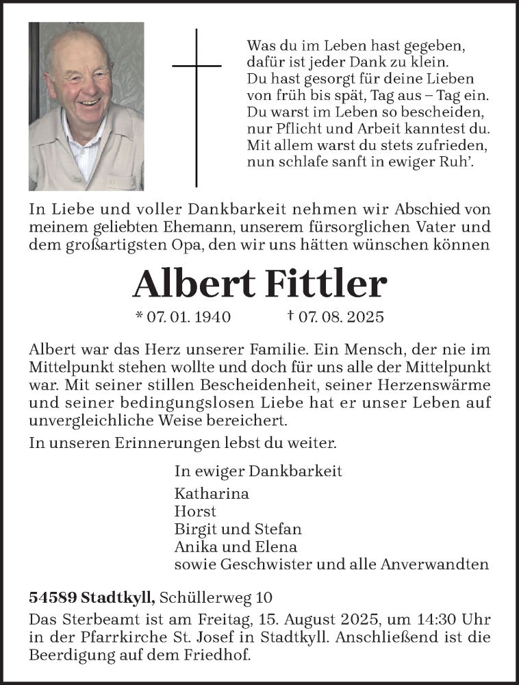 Hier finden Sie alle Traueranzeigen aus der Zeitung, die bisher für Albert Fittler erschienen sind. Weitere Traueranzeigen, die in der Zeitung erscheinen, werden hier ebenfalls aufgelistet