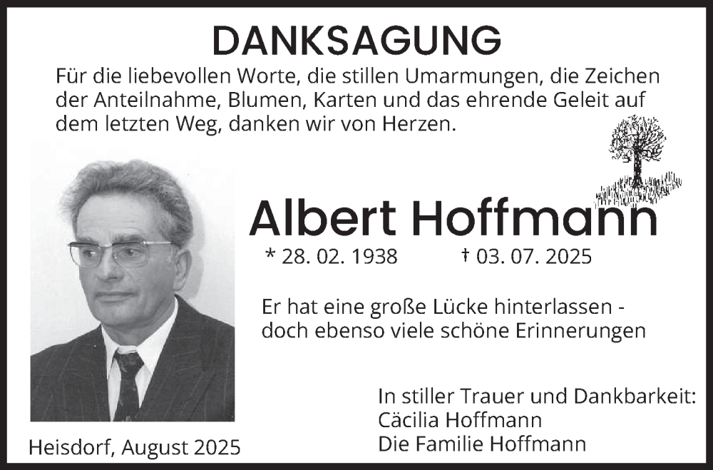 Hier finden Sie alle Traueranzeigen aus der Zeitung, die bisher für Albert Hoffmann erschienen sind. Weitere Traueranzeigen, die in der Zeitung erscheinen, werden hier ebenfalls aufgelistet