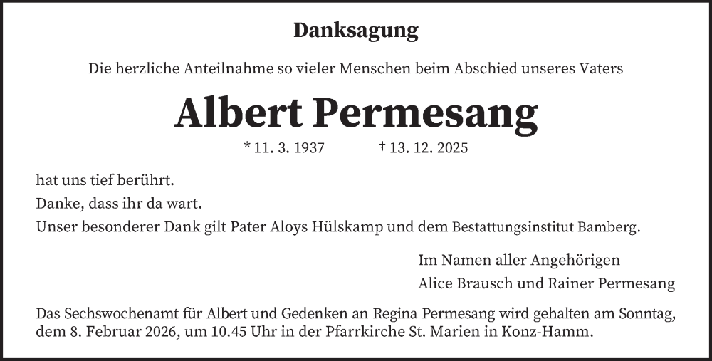 Hier finden Sie alle Traueranzeigen aus der Zeitung, die bisher für Albert Permesang erschienen sind. Weitere Traueranzeigen, die in der Zeitung erscheinen, werden hier ebenfalls aufgelistet