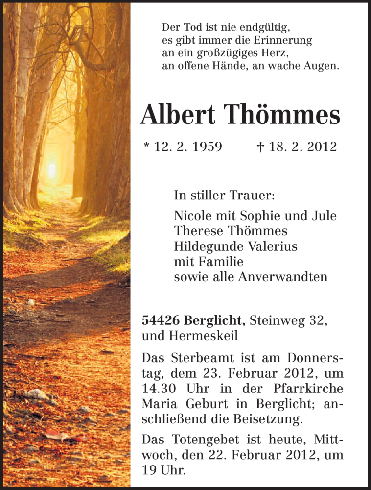 Hier finden Sie alle Traueranzeigen aus der Zeitung, die bisher für Albert Thömmes erschienen sind. Weitere Traueranzeigen, die in der Zeitung erscheinen, werden hier ebenfalls aufgelistet