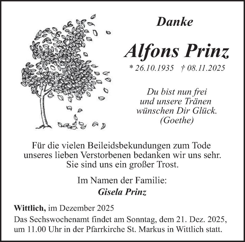 Hier finden Sie alle Traueranzeigen aus der Zeitung, die bisher für Alfons Prinz erschienen sind. Weitere Traueranzeigen, die in der Zeitung erscheinen, werden hier ebenfalls aufgelistet
