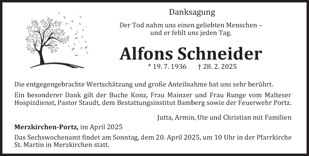 Hier finden Sie alle Traueranzeigen aus der Zeitung, die bisher für Alfons Schneider erschienen sind. Weitere Traueranzeigen, die in der Zeitung erscheinen, werden hier ebenfalls aufgelistet