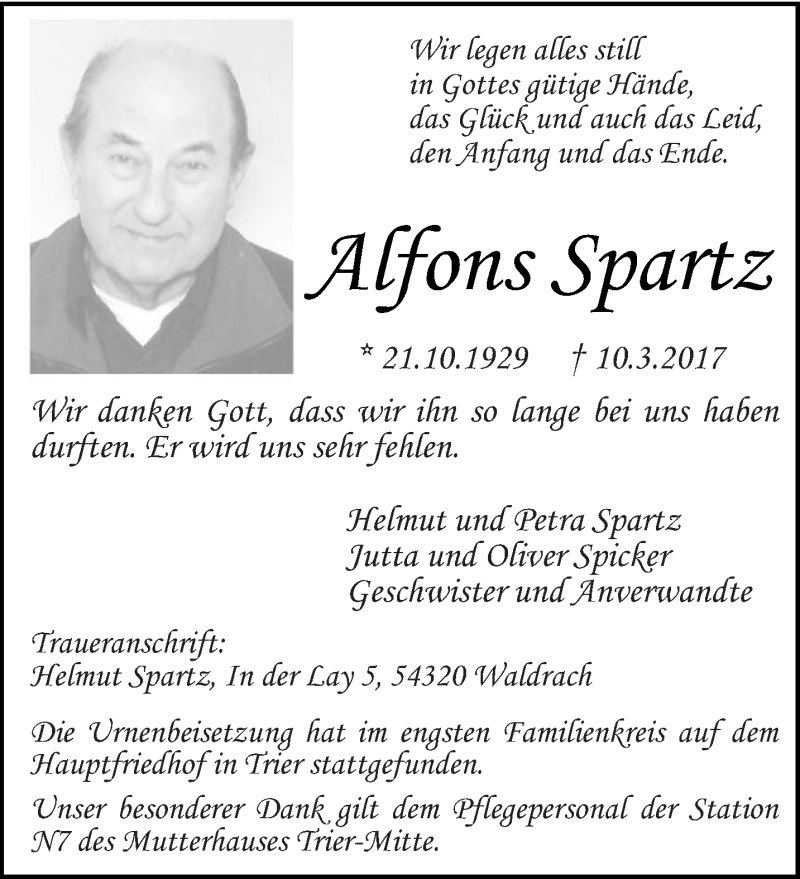 Hier finden Sie alle Traueranzeigen aus der Zeitung, die bisher für Alfons Spartz erschienen sind. Weitere Traueranzeigen, die in der Zeitung erscheinen, werden hier ebenfalls aufgelistet