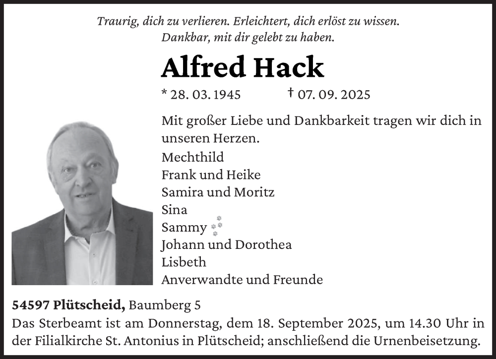Hier finden Sie alle Traueranzeigen aus der Zeitung, die bisher für Alfred Hack erschienen sind. Weitere Traueranzeigen, die in der Zeitung erscheinen, werden hier ebenfalls aufgelistet