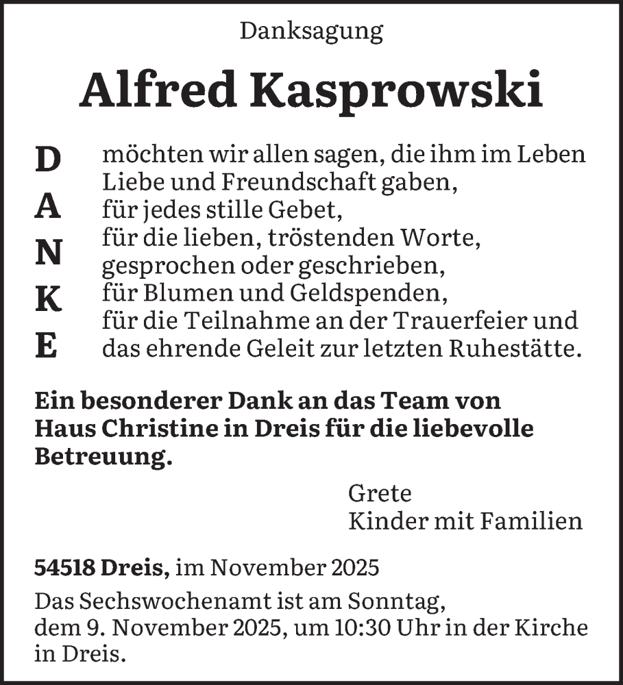 Hier finden Sie alle Traueranzeigen aus der Zeitung, die bisher für Alfred Kasprowski erschienen sind. Weitere Traueranzeigen, die in der Zeitung erscheinen, werden hier ebenfalls aufgelistet