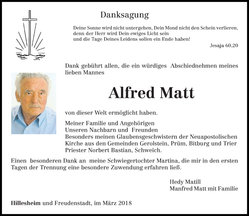 Hier finden Sie alle Traueranzeigen aus der Zeitung, die bisher für Alfred Matt erschienen sind. Weitere Traueranzeigen, die in der Zeitung erscheinen, werden hier ebenfalls aufgelistet