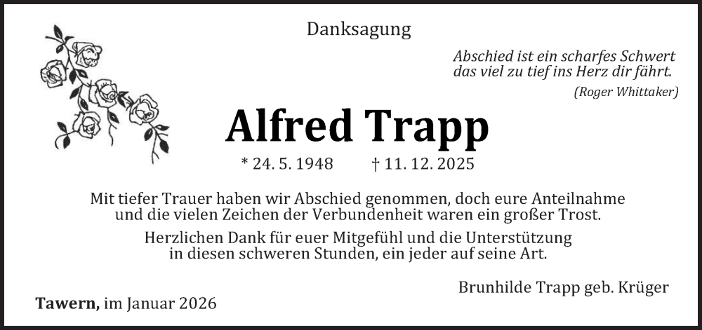 Hier finden Sie alle Traueranzeigen aus der Zeitung, die bisher für Alfred Trapp erschienen sind. Weitere Traueranzeigen, die in der Zeitung erscheinen, werden hier ebenfalls aufgelistet