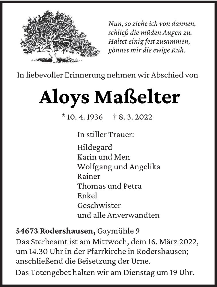 Hier finden Sie alle Traueranzeigen aus der Zeitung, die bisher für Aloys Maßelter erschienen sind. Weitere Traueranzeigen, die in der Zeitung erscheinen, werden hier ebenfalls aufgelistet