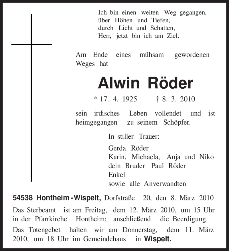 Hier finden Sie alle Traueranzeigen aus der Zeitung, die bisher für Alwin Röder erschienen sind. Weitere Traueranzeigen, die in der Zeitung erscheinen, werden hier ebenfalls aufgelistet