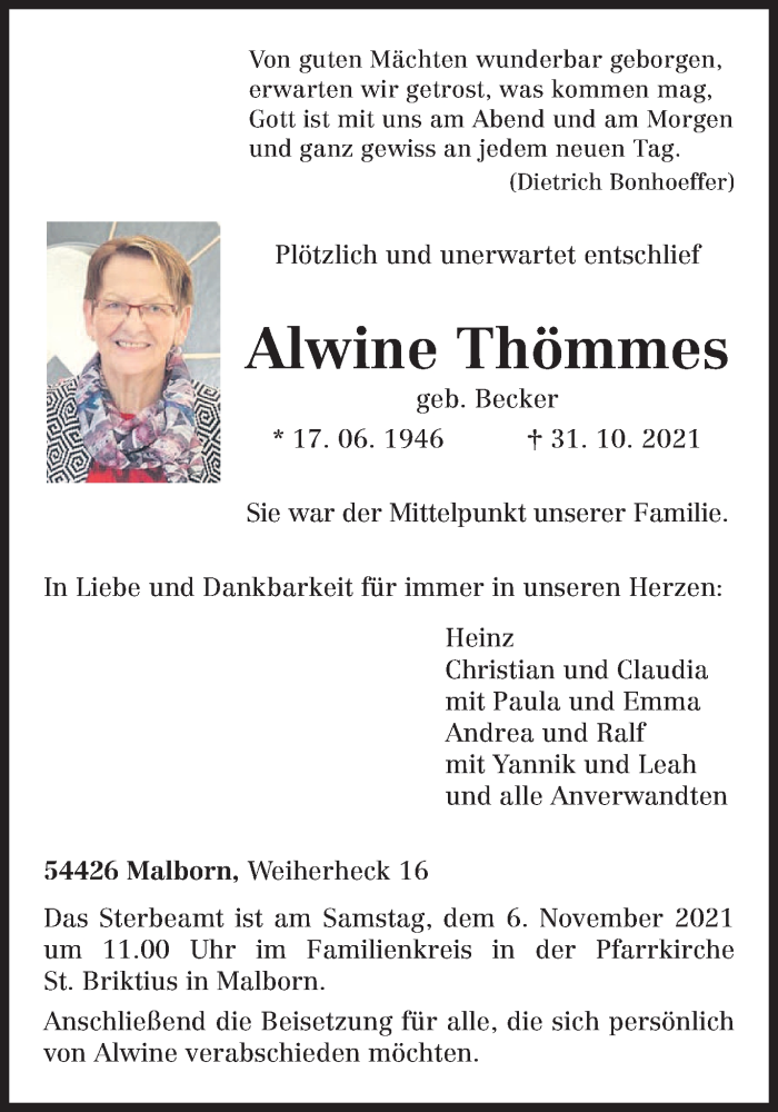 Hier finden Sie alle Traueranzeigen aus der Zeitung, die bisher für Alwine Thömmes erschienen sind. Weitere Traueranzeigen, die in der Zeitung erscheinen, werden hier ebenfalls aufgelistet