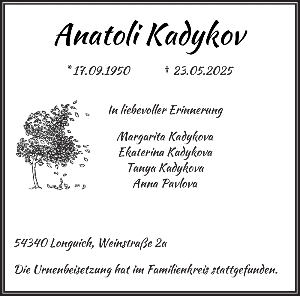 Hier finden Sie alle Traueranzeigen aus der Zeitung, die bisher für Anatoli Kadykov erschienen sind. Weitere Traueranzeigen, die in der Zeitung erscheinen, werden hier ebenfalls aufgelistet