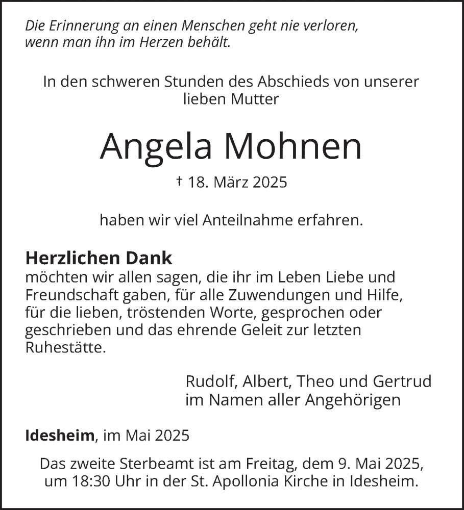 Hier finden Sie alle Traueranzeigen aus der Zeitung, die bisher für Angela Mohnen erschienen sind. Weitere Traueranzeigen, die in der Zeitung erscheinen, werden hier ebenfalls aufgelistet