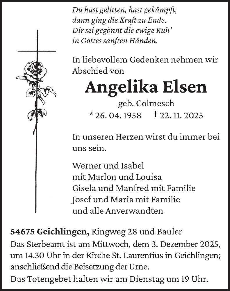Hier finden Sie alle Traueranzeigen aus der Zeitung, die bisher für Angelika Elsen erschienen sind. Weitere Traueranzeigen, die in der Zeitung erscheinen, werden hier ebenfalls aufgelistet