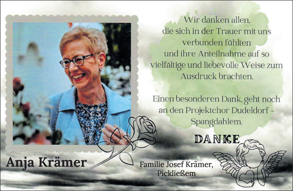 Hier finden Sie alle Traueranzeigen aus der Zeitung, die bisher für Anja Krämer erschienen sind. Weitere Traueranzeigen, die in der Zeitung erscheinen, werden hier ebenfalls aufgelistet