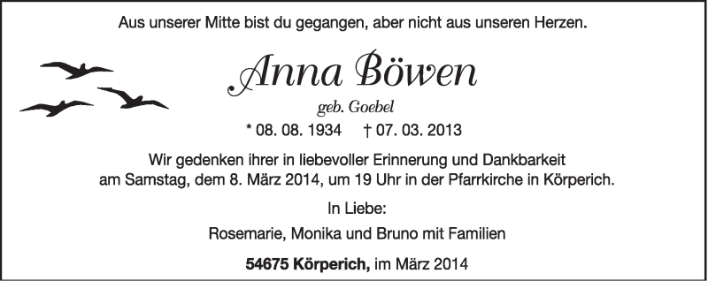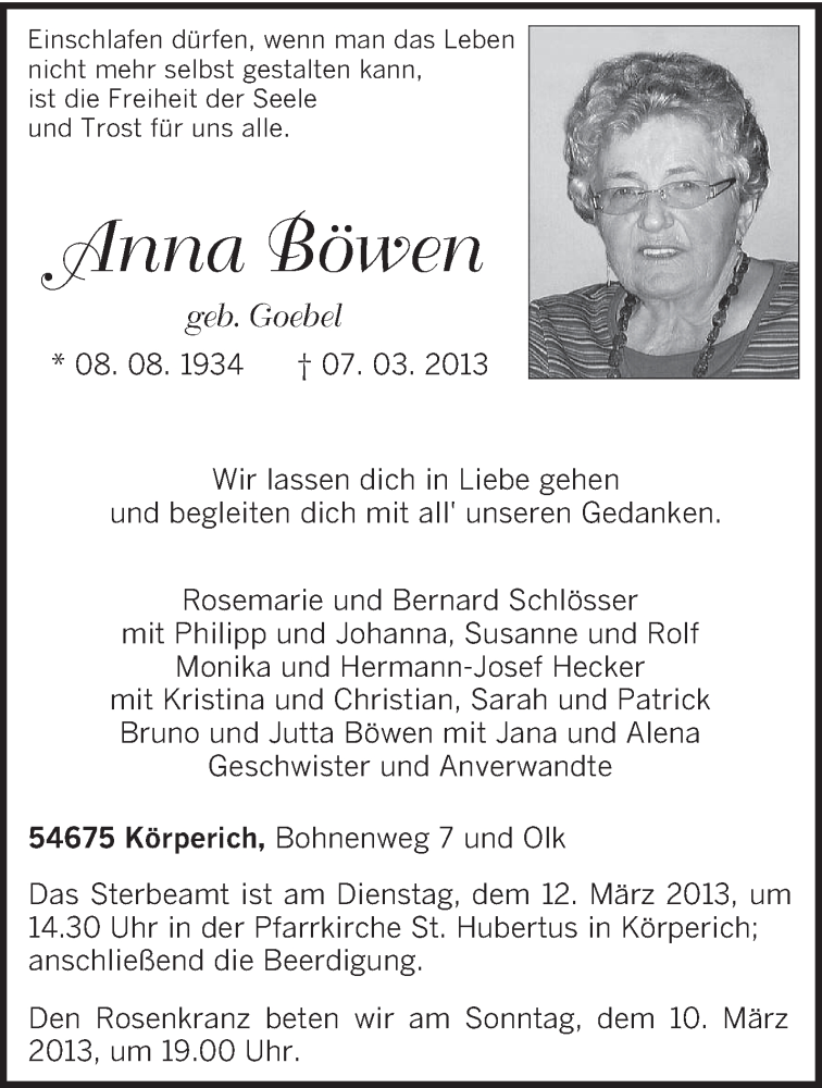 Hier finden Sie alle Traueranzeigen aus der Zeitung, die bisher für Anna Böwen erschienen sind. Weitere Traueranzeigen, die in der Zeitung erscheinen, werden hier ebenfalls aufgelistet