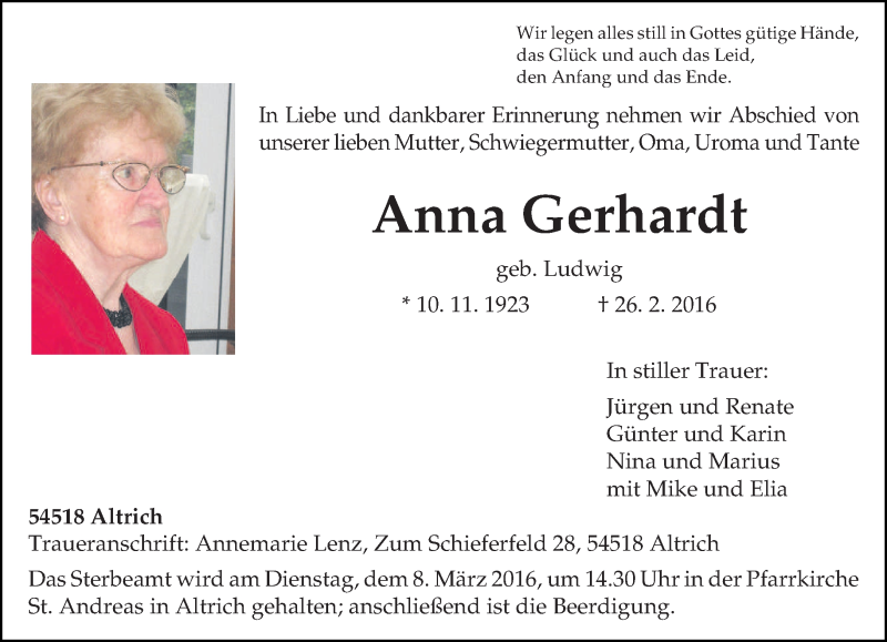 Hier finden Sie alle Traueranzeigen aus der Zeitung, die bisher für Anna Gerhardt erschienen sind. Weitere Traueranzeigen, die in der Zeitung erscheinen, werden hier ebenfalls aufgelistet