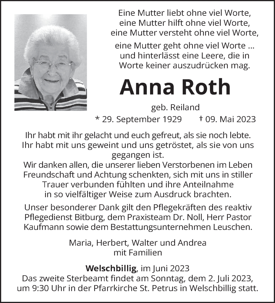Hier finden Sie alle Traueranzeigen aus der Zeitung, die bisher für Anna Roth erschienen sind. Weitere Traueranzeigen, die in der Zeitung erscheinen, werden hier ebenfalls aufgelistet