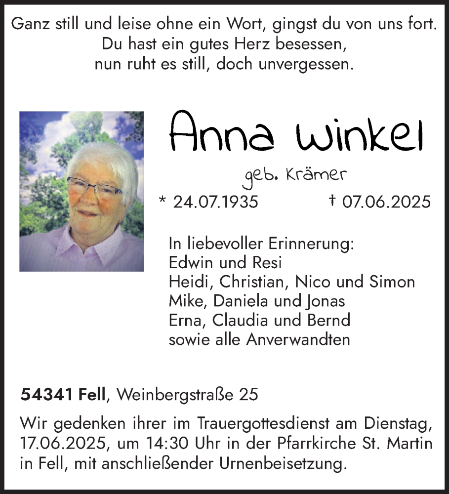 Hier finden Sie alle Traueranzeigen aus der Zeitung, die bisher für Anna Winkel erschienen sind. Weitere Traueranzeigen, die in der Zeitung erscheinen, werden hier ebenfalls aufgelistet
