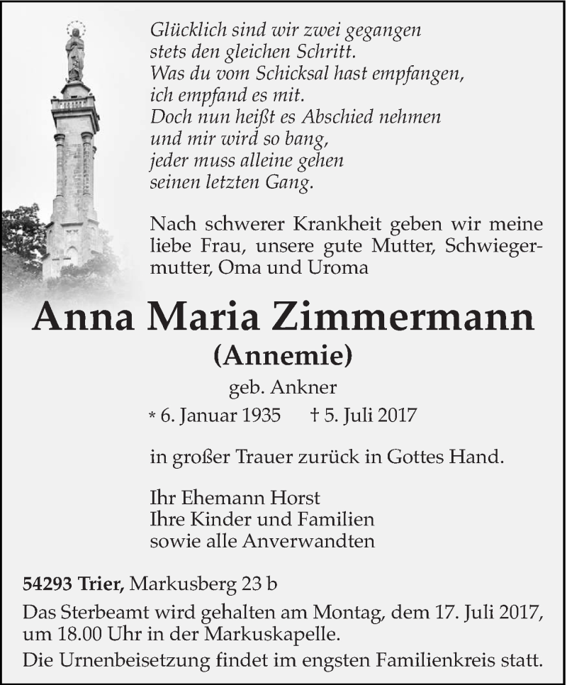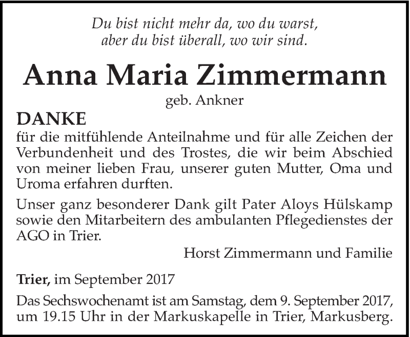Hier finden Sie alle Traueranzeigen aus der Zeitung, die bisher für Anna Maria Zimmermann erschienen sind. Weitere Traueranzeigen, die in der Zeitung erscheinen, werden hier ebenfalls aufgelistet