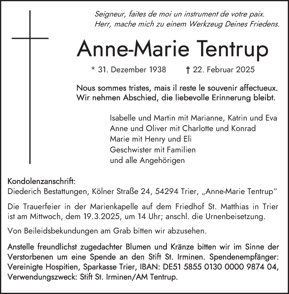 Hier finden Sie alle Traueranzeigen aus der Zeitung, die bisher für Anne-Marie Tentrup erschienen sind. Weitere Traueranzeigen, die in der Zeitung erscheinen, werden hier ebenfalls aufgelistet