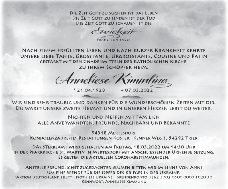 Hier finden Sie alle Traueranzeigen aus der Zeitung, die bisher für Anneliese Kimmling erschienen sind. Weitere Traueranzeigen, die in der Zeitung erscheinen, werden hier ebenfalls aufgelistet