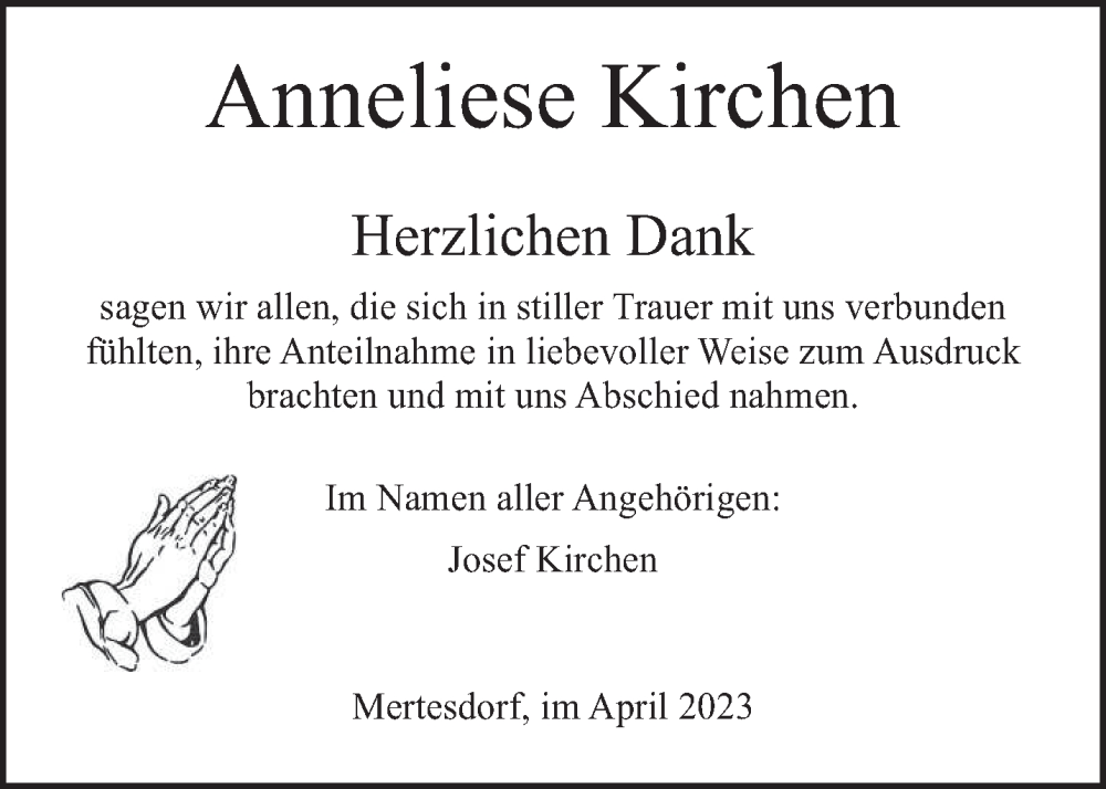 Hier finden Sie alle Traueranzeigen aus der Zeitung, die bisher für Anneliese Kirchen erschienen sind. Weitere Traueranzeigen, die in der Zeitung erscheinen, werden hier ebenfalls aufgelistet
