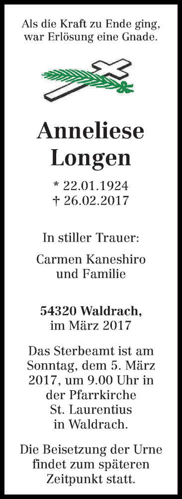 Hier finden Sie alle Traueranzeigen aus der Zeitung, die bisher für Anneliese Longen erschienen sind. Weitere Traueranzeigen, die in der Zeitung erscheinen, werden hier ebenfalls aufgelistet