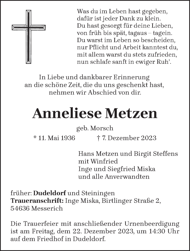 Hier finden Sie alle Traueranzeigen aus der Zeitung, die bisher für Anneliese Metzen erschienen sind. Weitere Traueranzeigen, die in der Zeitung erscheinen, werden hier ebenfalls aufgelistet