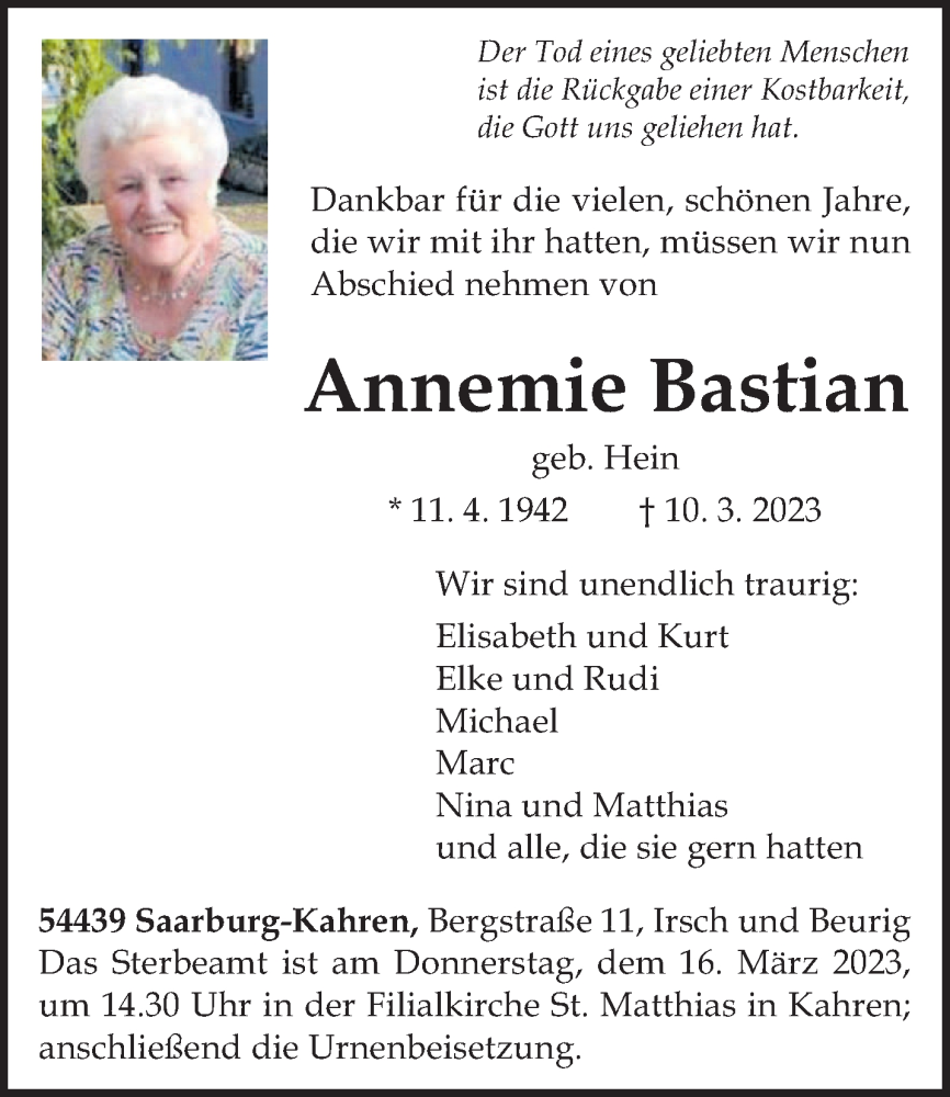 Hier finden Sie alle Traueranzeigen aus der Zeitung, die bisher für Annemie Bastian erschienen sind. Weitere Traueranzeigen, die in der Zeitung erscheinen, werden hier ebenfalls aufgelistet