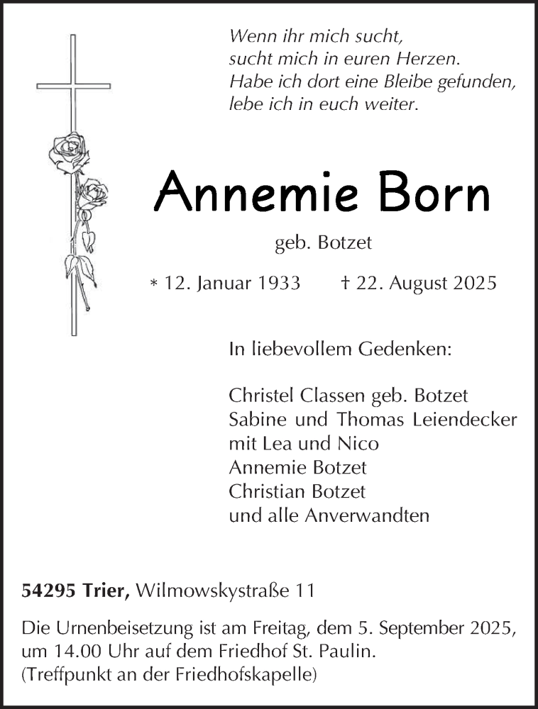 Hier finden Sie alle Traueranzeigen aus der Zeitung, die bisher für Annemie Born erschienen sind. Weitere Traueranzeigen, die in der Zeitung erscheinen, werden hier ebenfalls aufgelistet