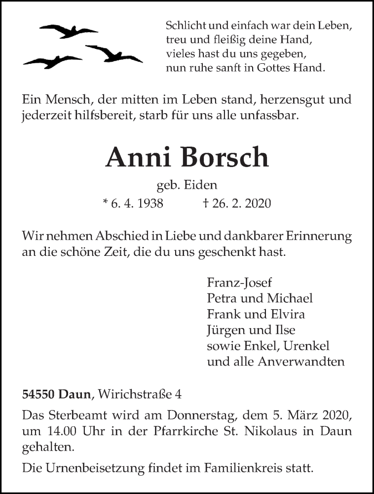 Hier finden Sie alle Traueranzeigen aus der Zeitung, die bisher für Anni Borsch erschienen sind. Weitere Traueranzeigen, die in der Zeitung erscheinen, werden hier ebenfalls aufgelistet