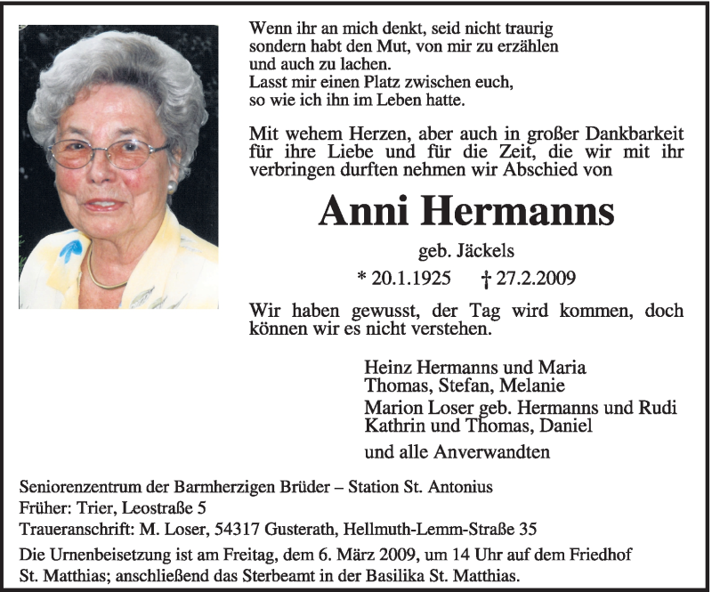 Hier finden Sie alle Traueranzeigen aus der Zeitung, die bisher für Anni Hermanns erschienen sind. Weitere Traueranzeigen, die in der Zeitung erscheinen, werden hier ebenfalls aufgelistet