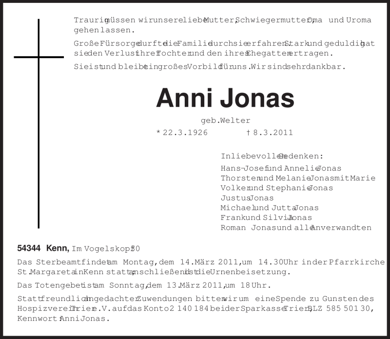 Hier finden Sie alle Traueranzeigen aus der Zeitung, die bisher für Anni Jonas erschienen sind. Weitere Traueranzeigen, die in der Zeitung erscheinen, werden hier ebenfalls aufgelistet