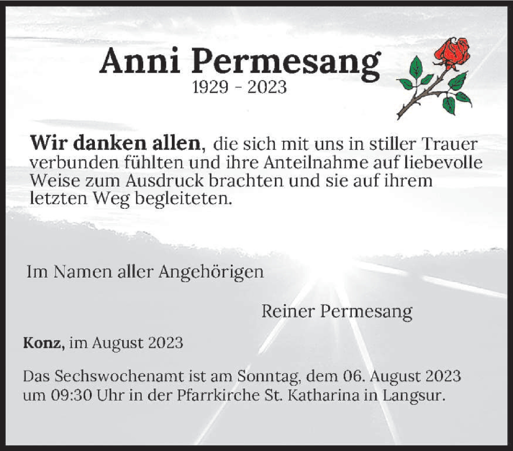 Hier finden Sie alle Traueranzeigen aus der Zeitung, die bisher für Anni Permesang erschienen sind. Weitere Traueranzeigen, die in der Zeitung erscheinen, werden hier ebenfalls aufgelistet