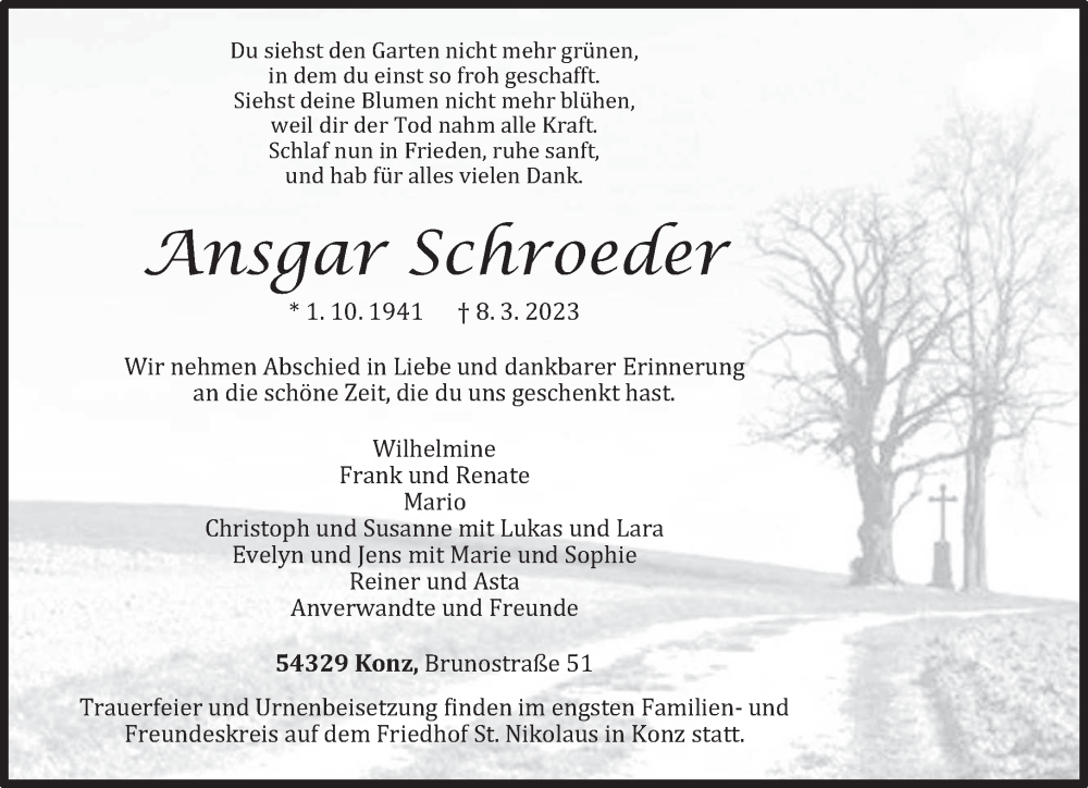 Hier finden Sie alle Traueranzeigen aus der Zeitung, die bisher für Ansgar Schroeder erschienen sind. Weitere Traueranzeigen, die in der Zeitung erscheinen, werden hier ebenfalls aufgelistet