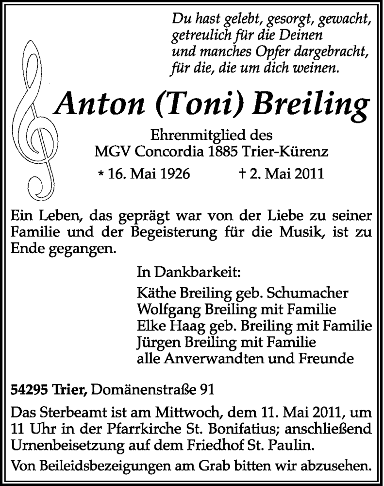 Hier finden Sie alle Traueranzeigen aus der Zeitung, die bisher für Anton Breiling erschienen sind. Weitere Traueranzeigen, die in der Zeitung erscheinen, werden hier ebenfalls aufgelistet