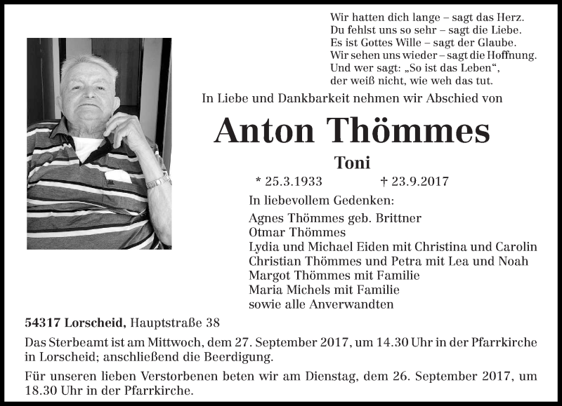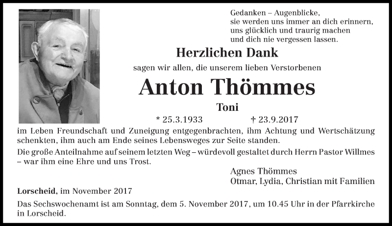 Hier finden Sie alle Traueranzeigen aus der Zeitung, die bisher für Anton Thömmes erschienen sind. Weitere Traueranzeigen, die in der Zeitung erscheinen, werden hier ebenfalls aufgelistet