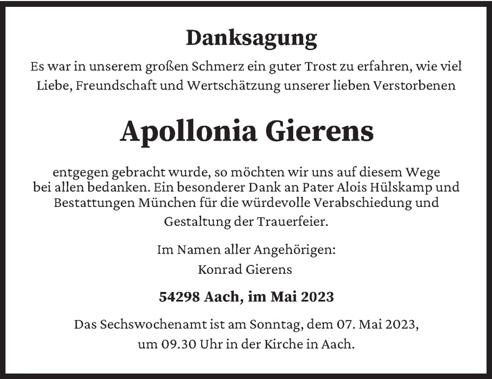 Hier finden Sie alle Traueranzeigen aus der Zeitung, die bisher für Apollonia Gierens erschienen sind. Weitere Traueranzeigen, die in der Zeitung erscheinen, werden hier ebenfalls aufgelistet