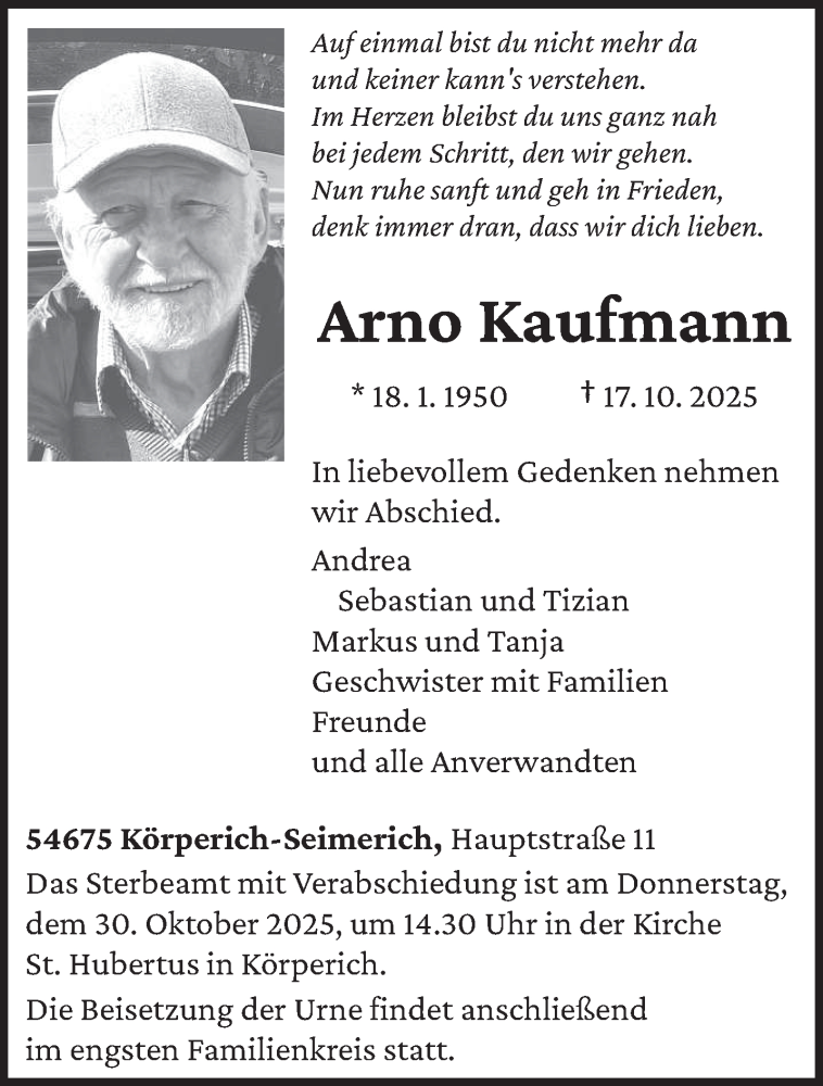 Hier finden Sie alle Traueranzeigen aus der Zeitung, die bisher für Arno Kaufmann erschienen sind. Weitere Traueranzeigen, die in der Zeitung erscheinen, werden hier ebenfalls aufgelistet