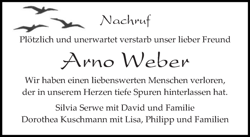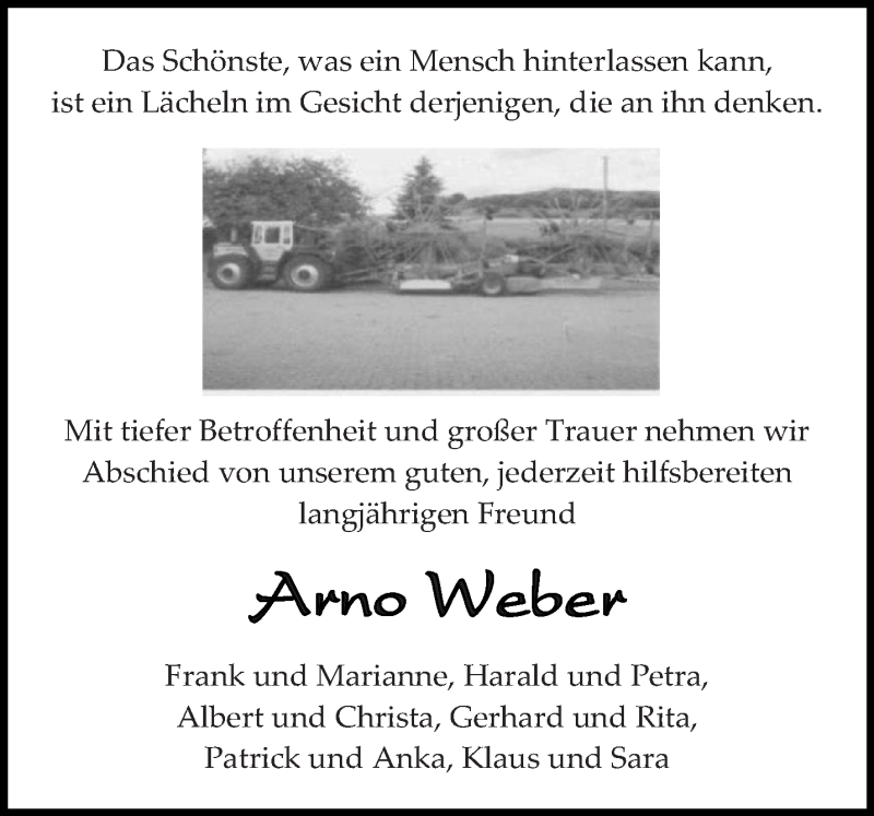 Hier finden Sie alle Traueranzeigen aus der Zeitung, die bisher für Arno Weber erschienen sind. Weitere Traueranzeigen, die in der Zeitung erscheinen, werden hier ebenfalls aufgelistet