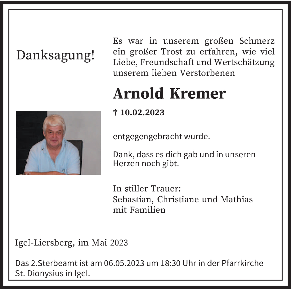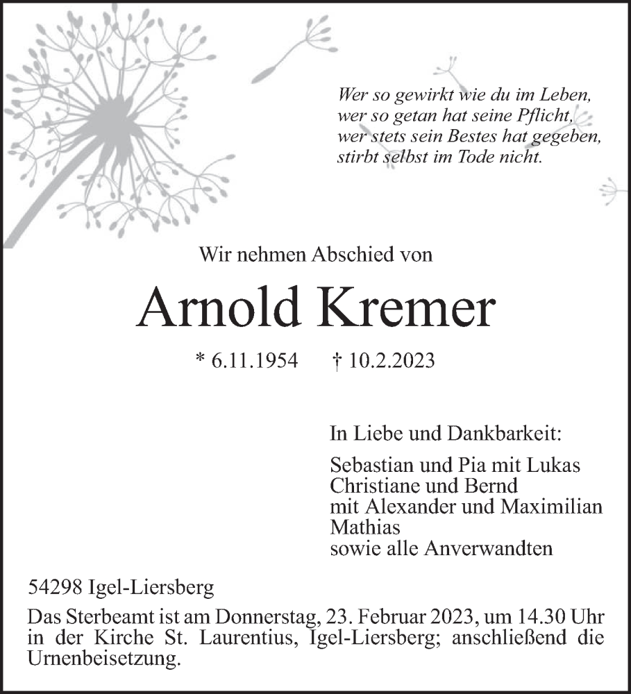 Hier finden Sie alle Traueranzeigen aus der Zeitung, die bisher für Arnold Kremer erschienen sind. Weitere Traueranzeigen, die in der Zeitung erscheinen, werden hier ebenfalls aufgelistet